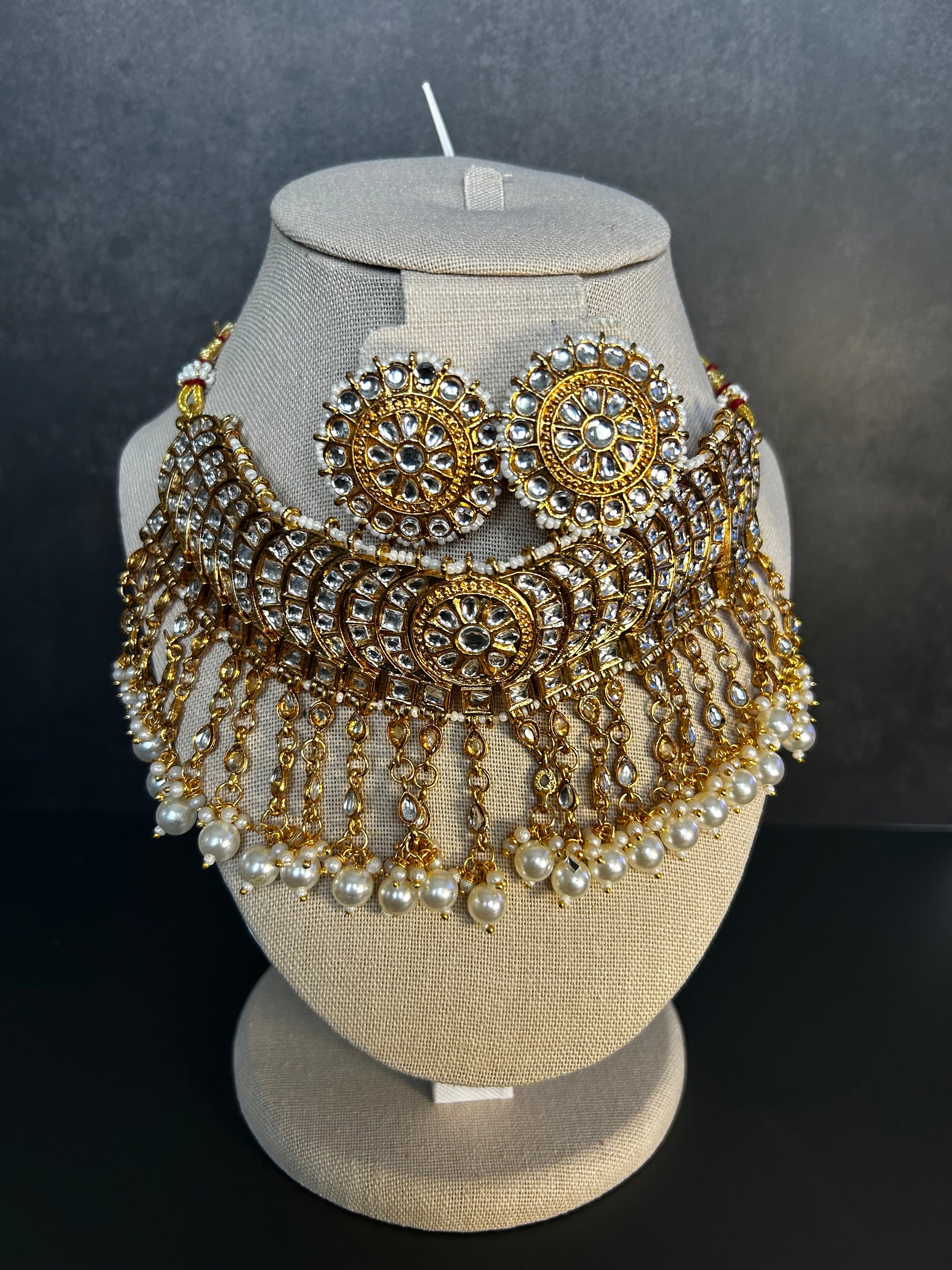 This stunning necklace set is a statement piece to wear for any event. It is white and gold with white pearls hanging. It comes with small delicate earrings for comfort wear.
