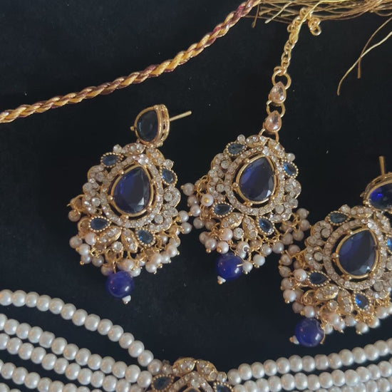This stunning necklace set has pearls and a big teardrop crystal in the middle. It comes in 4 beautiful colors and with earrings and tikka.
